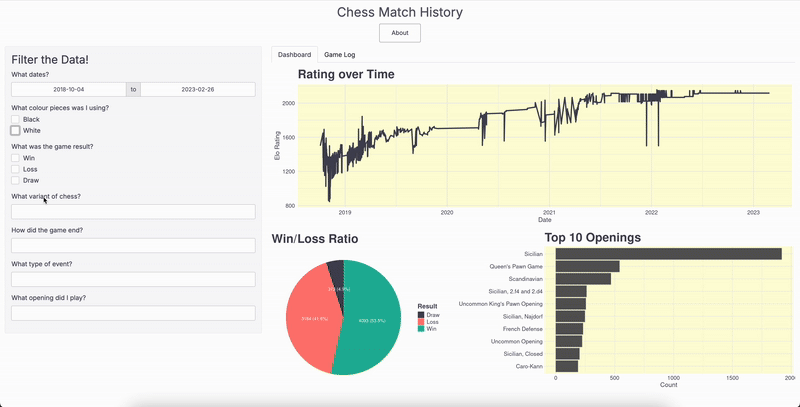 For an individual school project, I wanted to visualize the entire history of chess games I have played on the free online chess platform lichess. I created a dashboard using Shiny to visualize my games.