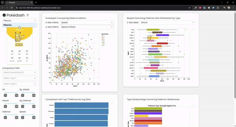 Created a dashboard using Dash to visualize and analyze Pokémon statistics, as part of a school group project.